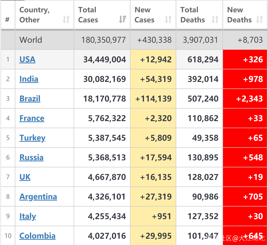 法國、土耳其、俄羅斯、英國、阿根廷、意大利、哥倫比亞分列累計確診第四到十位。隨着印度變種病毒的蔓延,俄羅斯、英國的病例數迅猛反彈,英國單日新增16,135例,創4****個月以來新高。