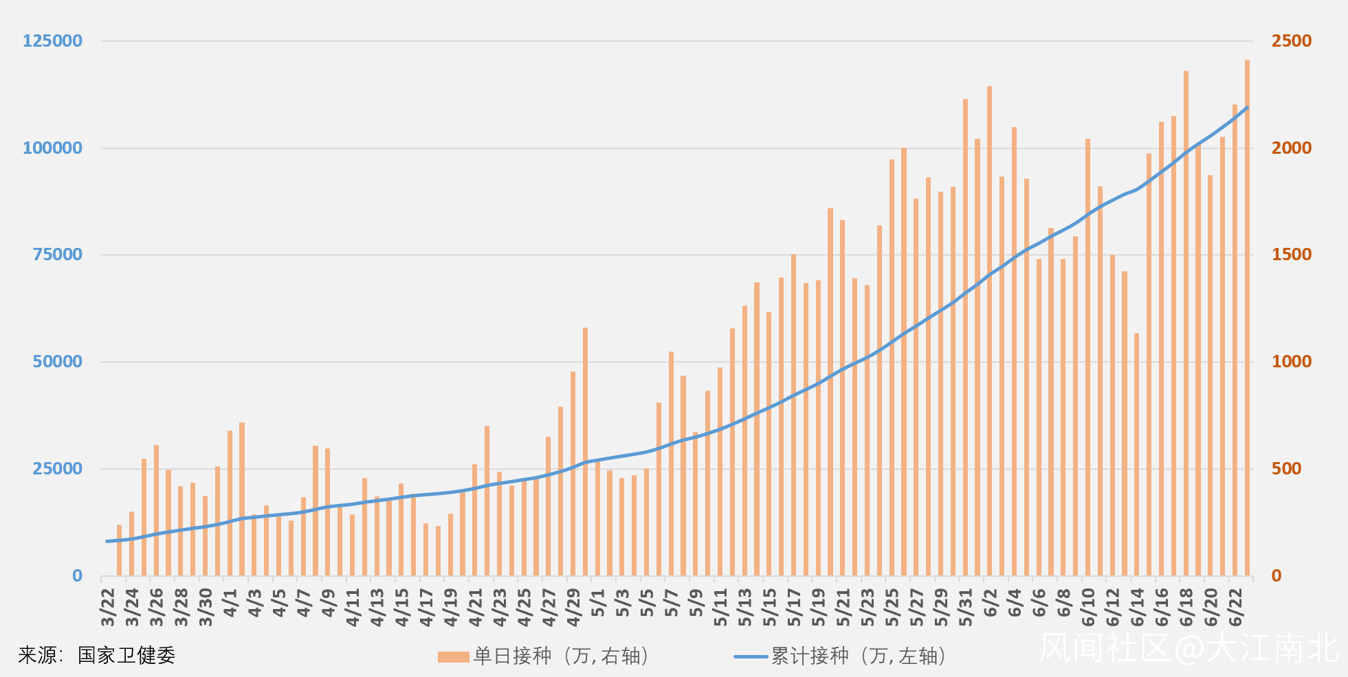 截止2021年6月23日,中國大陸累計接種新冠疫苗10.959億劑,逼近11億億劑大關,繼續位居全球第一位,佔全球累計接種劑數的39.3%,環比增加0.3%;其中單日新增接種2412萬劑,再創歷史新高,佔全球單日接種劑數的62.9%。我國自3月23日以來,日均接種1092萬劑。中國每百人累計接種76.13劑,環比增加1.67劑。