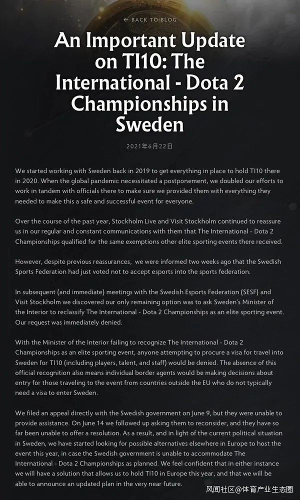 **在V社22日發佈的公告中,已經解釋了TI10橫生變故的原因——瑞典體育聯合會不接受電子競技入會,因此,相關電競賽事活動便無法獲得該組織給予的「綠卡」。**在如今瑞典的疫情防控政策下,沒有政府管理機構「開綠燈」,任何參與TI10人員的簽證都將被拒絕。