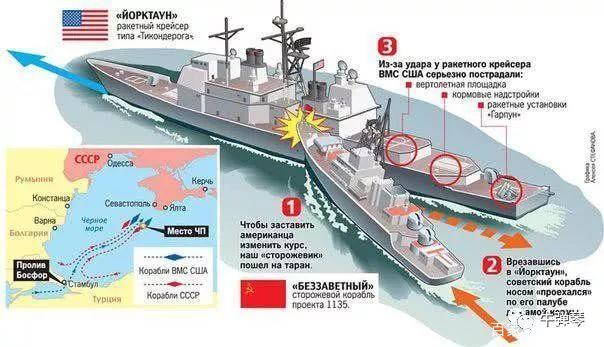 當時,美國海軍約克城號巡洋艦和卡隆號驅逐艦闖入黑海,宣示所謂的自由航行權,這遭到蘇聯海軍的強烈抗議。在警告無果後,兩艘蘇聯戰艦,隨即果斷撞向美艦!