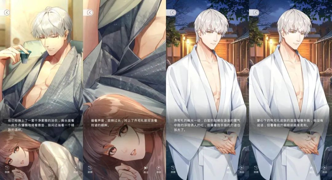 以齊司禮「氤氲之旅」的「心動」交互為例,我們可以選擇和他聊天或者喝酒壯膽。兩個分支的後續劇情有所區別,不變的是甜度爆表的立繪與文案。