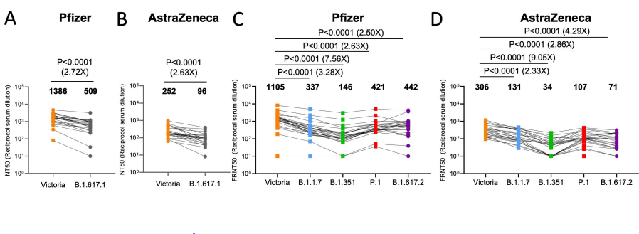 用注射過輝瑞、阿利斯康兩針劑疫苗的個體的血清進行中和測試,發現其對Kappa、Delta變異株的中和作用相較於標準株的中和作用也有不同程度的降低。
