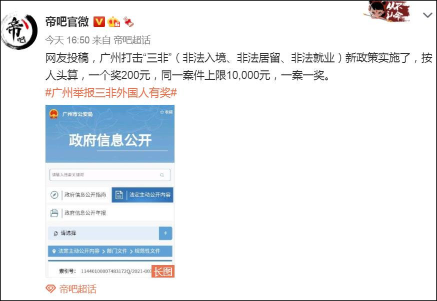 網友投稿,廣州打擊“三非”(非法入境、非法居留、非法就業)新政策實施了,按人頭算,一個獎200元,同一案件上限10,000元,一案一獎。