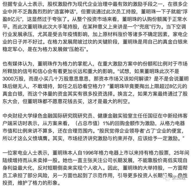 有一句話特別耐人尋味:“試想,如果董明珠此次不是3000萬股,而是小買幾十萬股意思意思,那資本市場又該如何解讀?是不是會説董明珠後繼無人,不敢增持,卸任之後恐看空格力?”