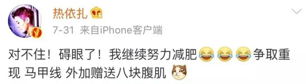 她在微博上回應道:“對不起,礙眼了,爭取重現馬甲線,外加贈送八塊腹肌。”