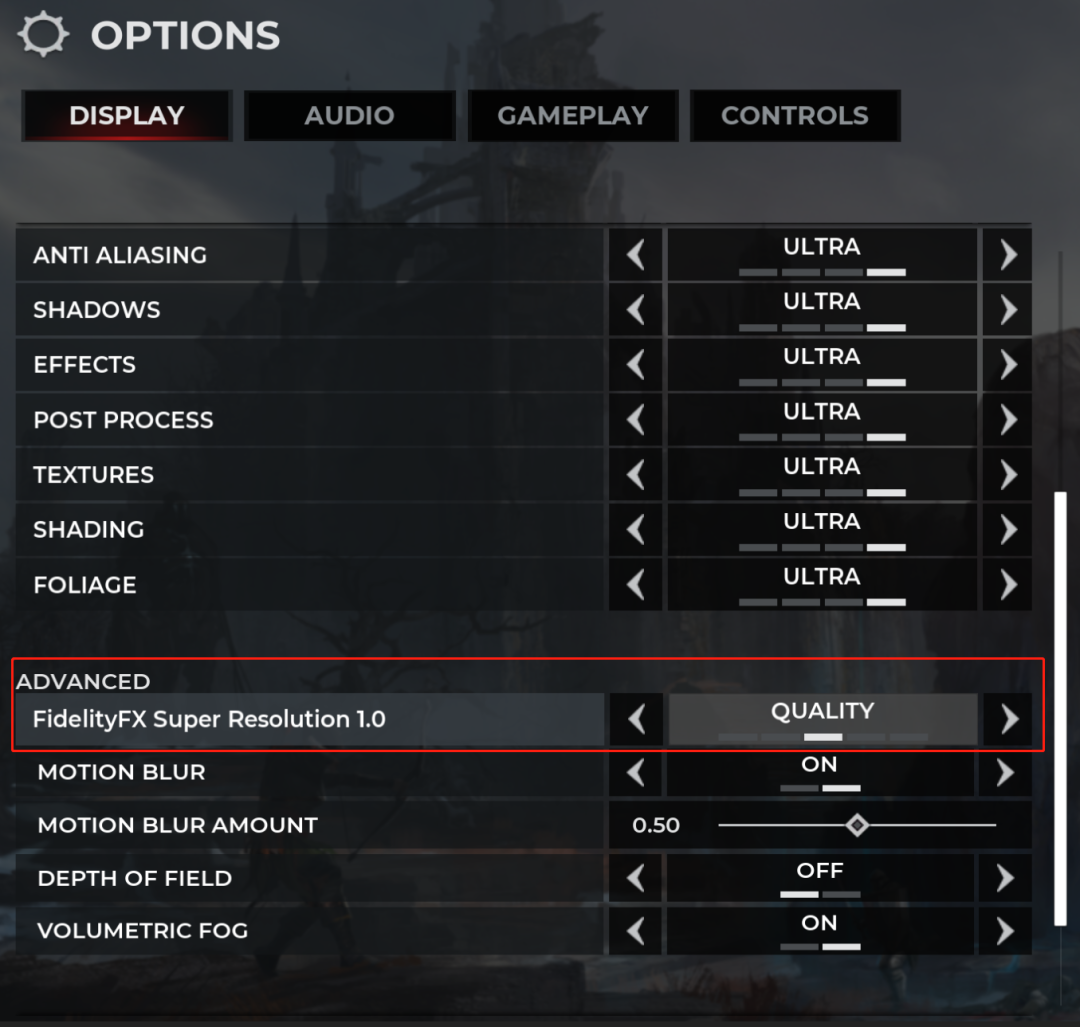 進到遊戲的圖像測試界面,啥驅動都不用更新,就能看到 FSR 1.0 的選項,一共有五個檔位提供給玩家挑選。