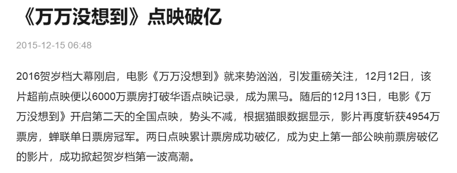但是,有些電影從業者往往會利用點映做文章,因為沒到正式上映日期,為了表面上的公平公正,豆瓣等幾個電影評分軟件並不能顯示鬼知道有沒有看過的觀眾的評分。因此,如果我們把原本應該是是“小規模”的點映,變成“大規模”的點映,那麼,這部電影品質究竟如何,就成了一個薛定諤式的未解之謎,出品方也就可以規避評分網站對於票房的影響,通過點映賺信息不對等的快錢。首先抓住這一漏洞大做文章的電影是《萬萬沒想到》,在2015年,該片就憑藉史無前例的超大規模點映票房過億,創造了不僅是中國電影、大概也是世界電影中一個前無古人後無來者最快票房過億記錄:負五天。