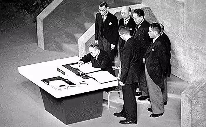 ▲梅津美治郎在降書上簽字,日本無條件投降