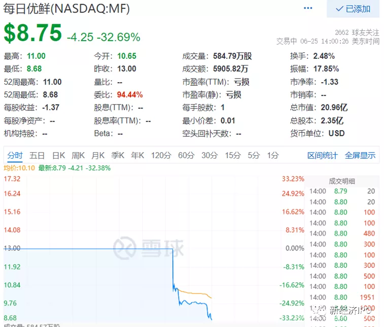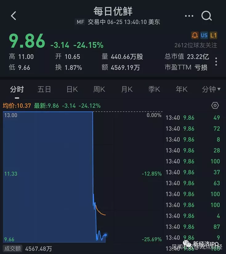 北京時間6月26日凌晨,每日優鮮$每日優鮮(MF)$開盤暴跌25%,截至北京時間凌晨1:45,每日優鮮報價9.8美元,較IPO價為13美元/ADS,下跌約25%;凌晨兩點,每日優鮮再度暴跌至8.68美元,跌幅達33%,製造了近期中概股上市後堪稱災難級的破發現場。