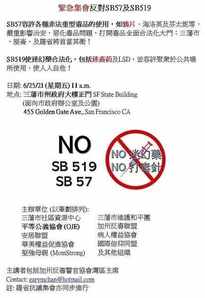 據資料顯示,SB 57和SB 519提案均由舊金山民主黨參議員威善高(Scott Wiener)提出。出席25日集會的嘉賓包括平等公義協會(OJE)主席、加州反毒品聯盟灣區分部主任李少敏(Frank Lee),加州首府薩克拉門託(Sacramento)縣地檢官Anne Marie Schubert,奧克蘭(Oakland)中國城商會會長陳錫澎( Carl Chan),庫比蒂諾(Cupertino)副市長Liang Chao等10位演講嘉賓。
