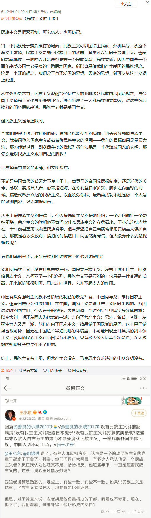 有網友私信了我一篇文字《民族主義的上限》(如下圖所示,作者已隱去),問我怎麼看。