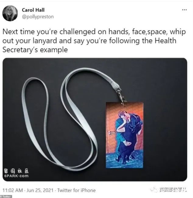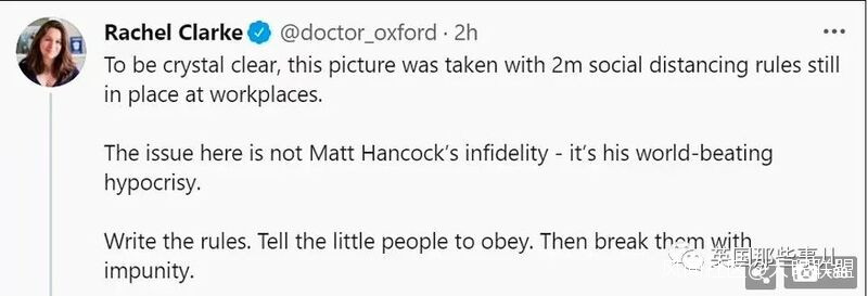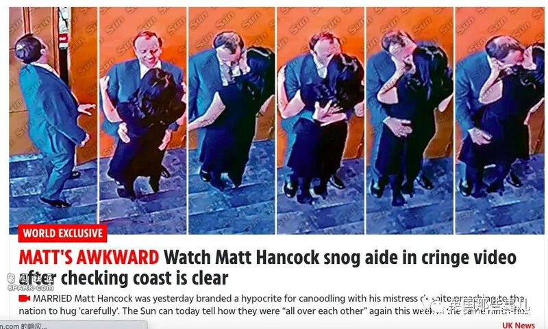 “我們希望他能帶領我們的走出痛苦的疫情和隔離,然而他滿腦子只有他姓氏的後半部分”(Matt姓Hancock,後半部分C**K,下半身的意思… )“最應該帶頭遵守新冠防疫規定的人,如今卻成了違反者。除非他今天就走人,否則今後政府下達任何新冠的管理規定,都不會有人聽了。”工黨領袖的表示:“如果Matt用納税人的錢,把自己的情人招進衞生部,並在自己辦公室跟她偷偷出軌,那這就是濫用權力,明顯的利益衝突。”Matt之前就被控浪費納税人的錢,讓養老院的老人暴露在新冠病毒之下,現在又被發現他自己也違法防疫規定。他完全不稱職,鮑里斯應該解僱他。”