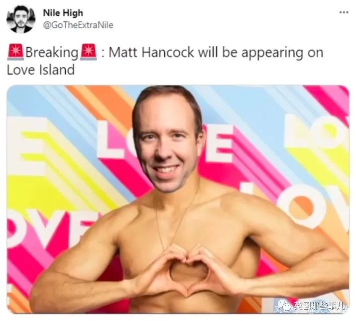 一些網友,直接搞起了梗圖。“突發,Matt Hancock即將參加下屆真人相親節目愛情島。”