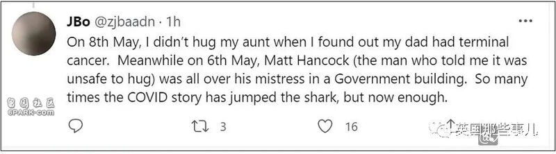 “5月8日,當我得知我父親得了晚期癌症的時候,我沒有擁抱我姑姑。同時在5月6日,Matt Hancock(那個告訴我們擁抱是不安全的人),卻在政府辦公室,整個人都貼到了情人身上。太多這樣的故事,真的受夠了!”