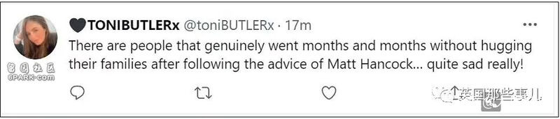 “5月8日,當我得知我父親得了晚期癌症的時候,我沒有擁抱我姑姑。同時在5月6日,Matt Hancock(那個告訴我們擁抱是不安全的人),卻在政府辦公室,整個人都貼到了情人身上。太多這樣的故事,真的受夠了!”