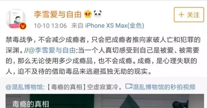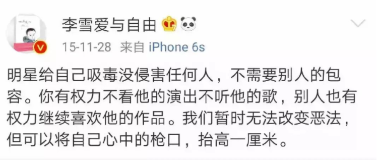 而對於吸毒的明星,非但不討伐,還表示支持。