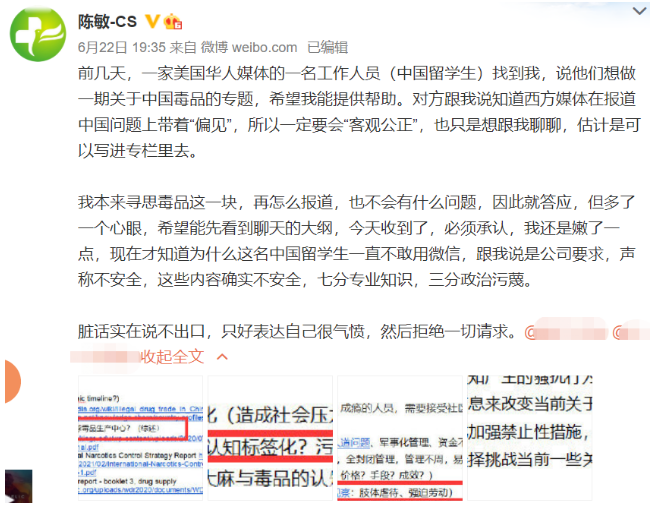 6月22日,科普作者陳敏在微博透露,一家美國華人媒體的工作人員(中國留學生)找到他,説想做一期關於中國毒品的專題。