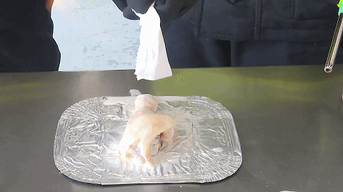 明火熄滅後,雞腿表面已經被燒得有些焦黃。這如果是發生在人的皮膚上,後果將不堪設想。