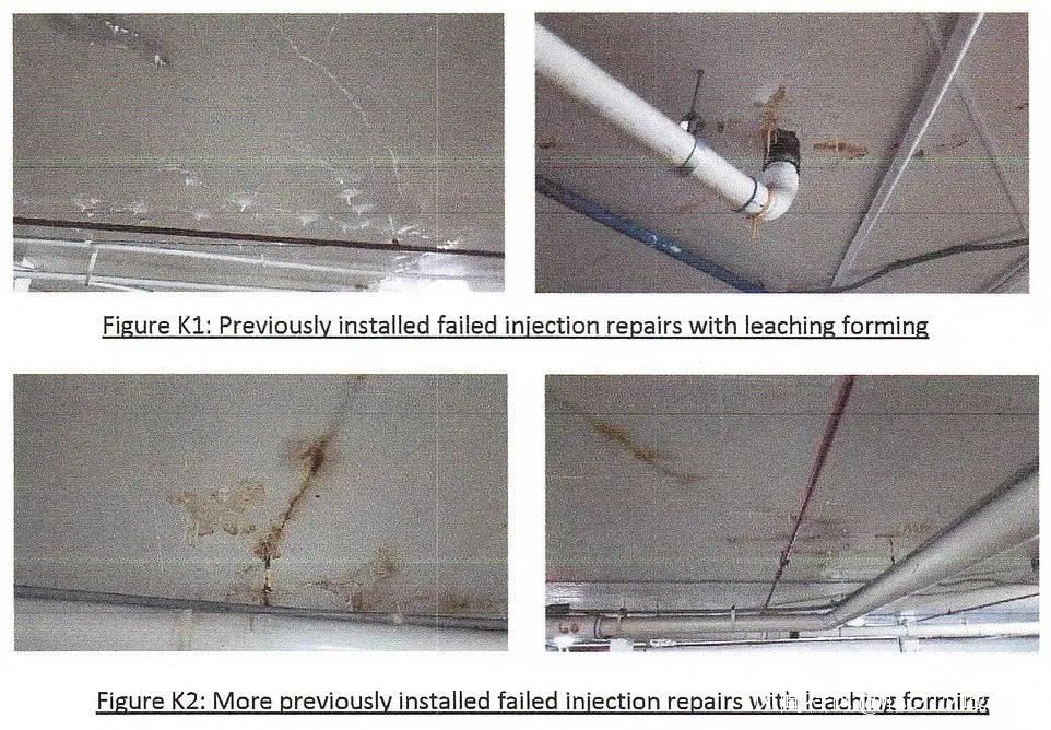 這個現場結構勘查報告中,特別提出了幾點隱患擔憂,包括游泳池的防水不合格,同時地下停車場已經佈滿大量裂痕。報告中提到了要求對鋼筋混凝土結構提供“額外的保護,並且允許採用更經濟的外膜修復或者替換來實現。”