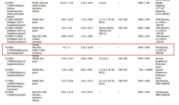 作者:知乎用户鏈接:https://www.zhihu.com/question/53525308/answer/604615284來源:知乎著作權歸作者所有。商業轉載請聯繫作者獲得授權,非商業轉載請註明出處。2014年希臘愛琴大學環境考古實驗室的Ioannis Liritzis教授對埃及的古建築(河谷神廟,孟卡拉金字塔,吉薩獅身人面像,阿拜多斯的塞提一世神廟等)做了表面光釋光測年。I. Liritzis, A. Vafiadou, ‘Surface Luminescence Dating of Some Egyptian Monuments’, Journal of Cultural Heritage (2014), http://dx.doi.org/10.1016/j.culher.2014.05.007