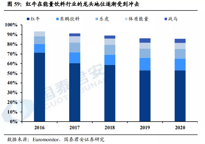 根據Euromonitor數據,按銷售額計,2020年行業龍頭紅牛的市佔率達到53%,東鵬飲料、樂虎、體質能量及戰馬市佔率則分別達到12.1%、10.1%、6.2%和4.2%,CR5合計達到85.6%。