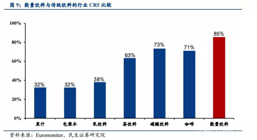 相較於傳統飲料,功能飲料不僅具備飲料行業高盈利的特徵,同時還兼具高成長、長生命週期、高集中度、易誕生大單品的行業屬性。過去十年功能飲料行業CR5份額均維持在80%~90%左右。相較之下,傳統飲料競爭格局較為分散,如茶飲料CR5為63%,果汁CR5為32%,乳飲料CR5為38%。