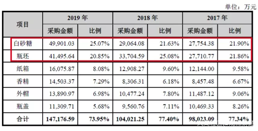 而且,來自白砂糖、PET瓶胚等原料包材佔生產成本比重較高,2019年二者相加大約佔了公司45.92%的成本,若採購價格出現過快上漲將對東鵬飲料整體的毛利率產生影響。