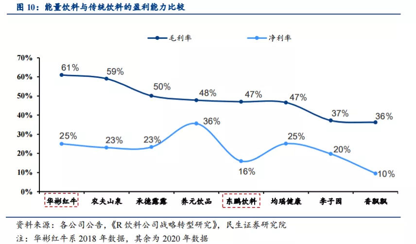 功能飲料具備品牌溢價的屬性,表現為功能飲料品牌商盈利能力優於傳統飲料,例如龍頭華彬紅牛的毛利率、淨利率均高於傳統飲料龍頭,即便是採取“親民”定價的東鵬飲料也具備 47%的毛利率。