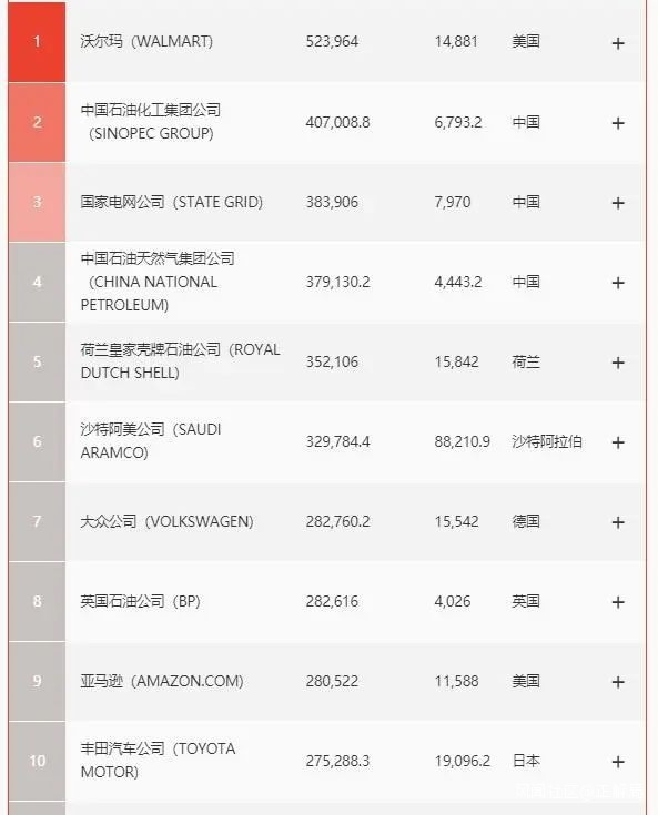 2020年世界500強排行榜前十