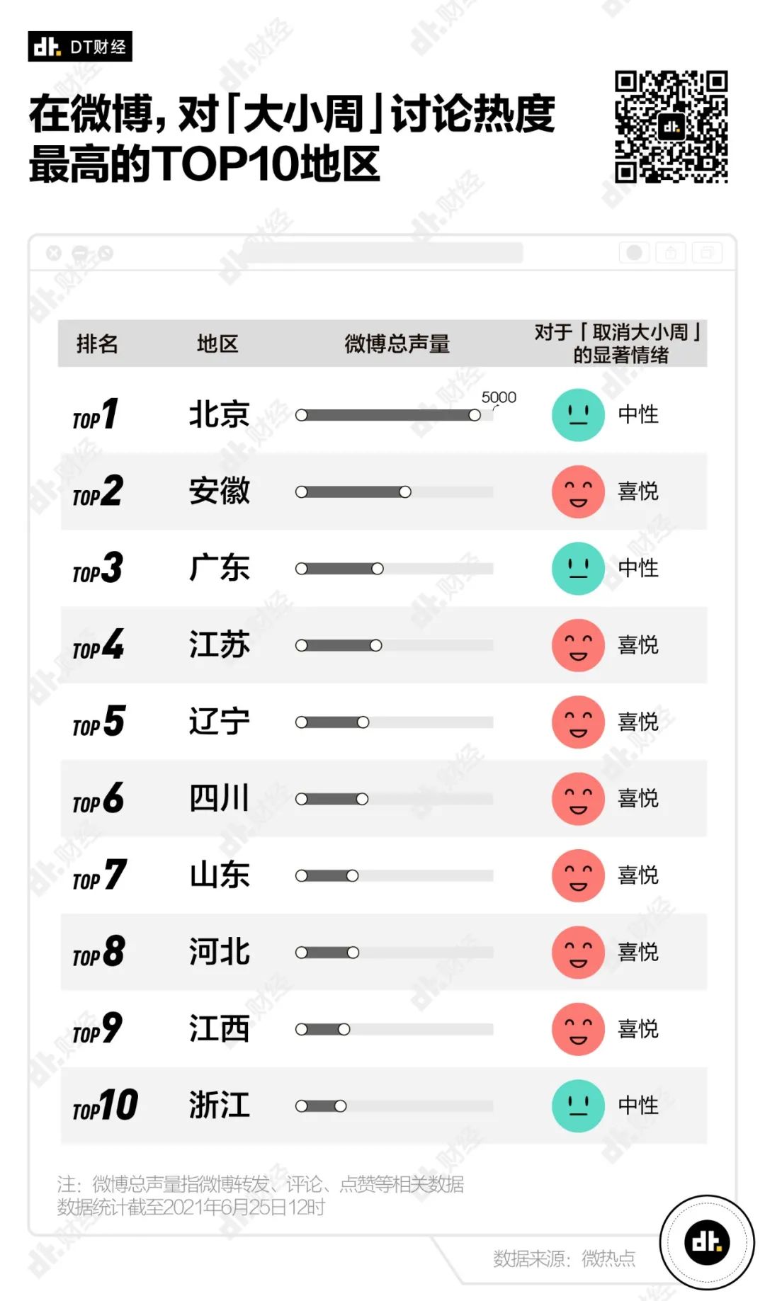 微博上,對「大小周」討論熱度最高的TOP10地區中,當大部分地區都認為取消大小周是一件好事、表現出喜悦的時候,北京、廣東、浙江這三個互聯網大廠主要分佈的地區,顯著情緒都是中性的。