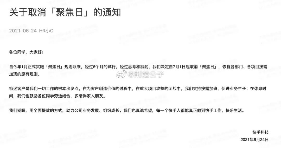 根據36氪的報道,快手內部的大小周被稱為「聚焦日」,今年1月開始試運行。經過半年試運行後,決定取消。如果有項目需要加班,快手將按規定付工資。週末加班支付2倍工資,國家法定節假日加班則支付3倍工資。
