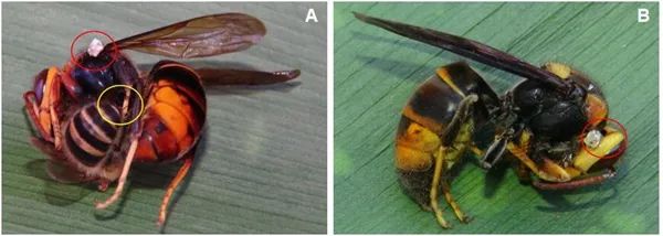 被蜜蜂結團殺死的凹紋胡蜂上還留有蜜蜂蟄針