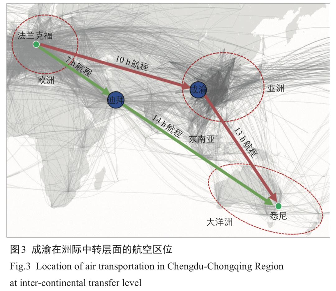 以全球航空格局為例。據曾永松等人研究,成都處於歐洲-澳洲黃金航線中間位置,並且中國至歐洲、澳洲的航空市場潛力巨大,可與迪拜等中東、南亞城市競爭洲際中轉客流,潛在腹地範圍廣闊。但有迪拜、中國香港、新加坡等塔尖城市“守擂”,成都想要突圍並非易事。