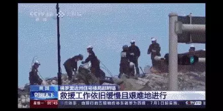 佛羅里達州邁阿密濱海公寓,美國的救援人員們正在接力徒手清理廢墟上的磚頭,“救援工作緩慢而艱難的進行着……”