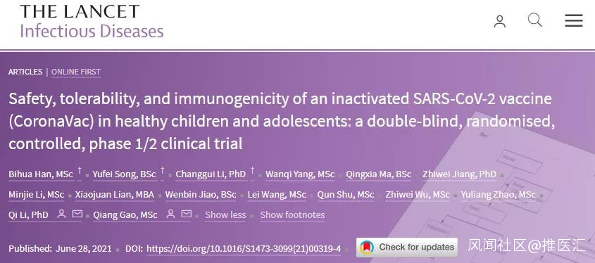 當地時間6月28日,國際權威醫學期刊《柳葉刀-感染病學》(The Lancet Infection Disease)最新在線發表新冠滅活疫苗克爾來福(CoronaVac)在健康兒童和青少年中的1/2期臨牀試驗結果。試驗初步評估表明,兩劑CoronaVac疫苗用於3-17歲人羣安全、可耐受,超過96%的受試者體內產生了中和抗體。