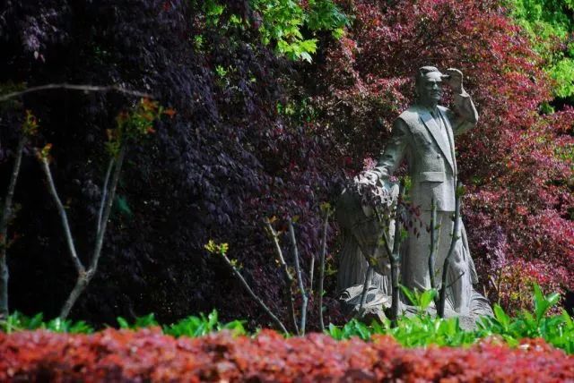 武漢大學的李四光雕像,李四光站在一頭毛驢前方,舉手遮陽遠眺(圖源:武漢大學)