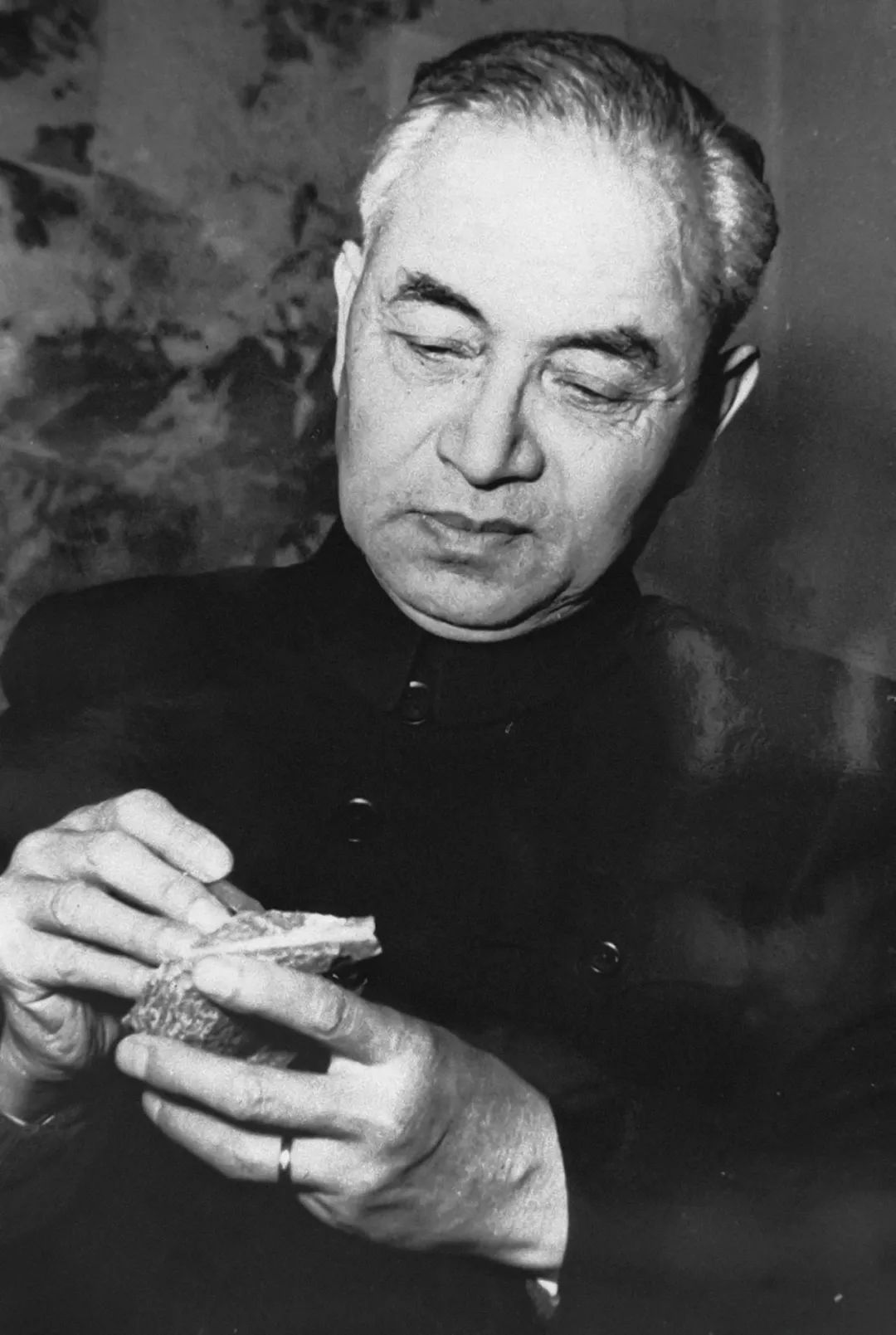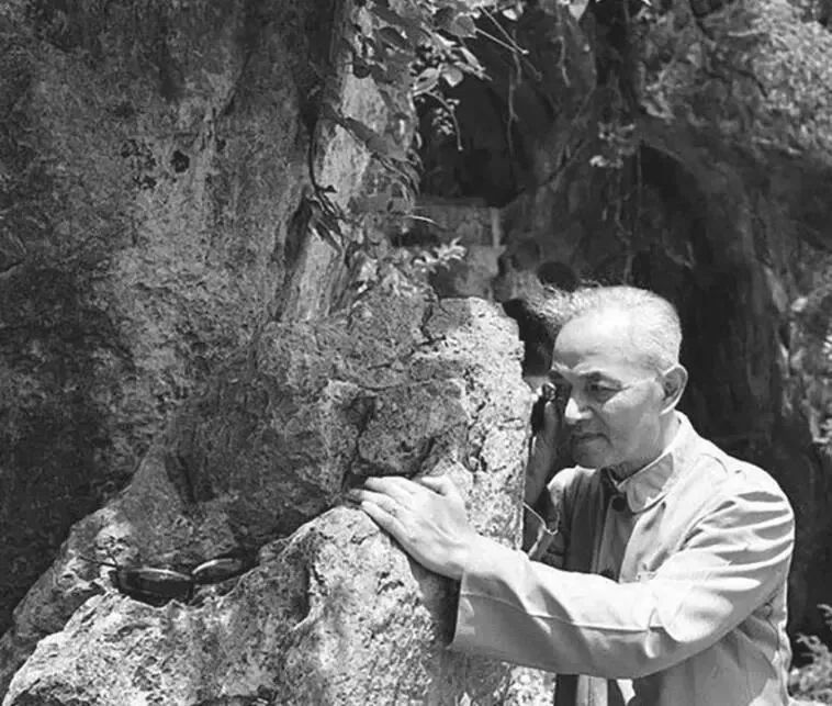 1957年6月,李四光在杭州飛來峯用放大鏡察看石灰岩中的有孔蟲化石