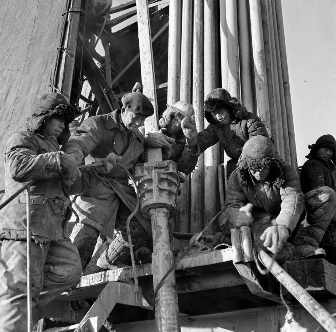 大慶油田鑽井第二大隊大隊長王進喜(左二)和工人們一起鑽井