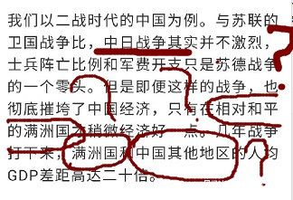 『我們以二戰時代的中國為例。與蘇聯的衞國戰爭比,中日戰爭其實並不激烈,士兵陣亡比例和軍費開支只是蘇德戰爭的一個零頭。但是即便這樣的戰爭,也徹底摧垮了中國經濟,只有在相對和平的滿洲國才稍微經濟好一點。幾年戰爭打下來,滿洲國和中國其他地區的人均GDP差距高達二十倍。』