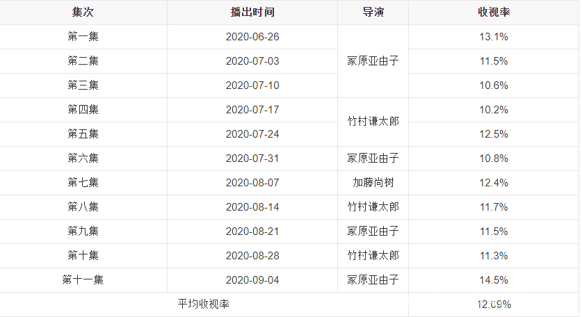 它在日本的收視也是一路長虹,從第一集到最後一集都保持着雙位數的收視率。