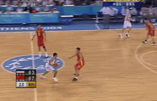 然後,姚明又在防守端不惜體力地擴出禁區、防到三分線,像個小球時代的全能中鋒那樣,封死了對方核心後衞的持球跳投。