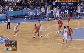 隨後,姚明再次挺身而出,連續兩個回合,姚明在籃下頂着多人出手造成犯規,在杜鋒罰進那關鍵兩球之前,是姚明連續罰進4球,幫助中國隊扳平、逆轉。