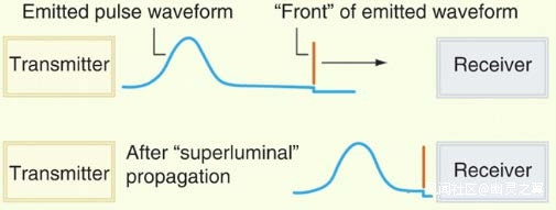 對於光脈衝而言,這段波峯傳播的速度,是光的“羣速度”,也就是光信號傳播的實際速度。對於理想狀態中的電磁場而言,a點的速度,是光波的前沿速度