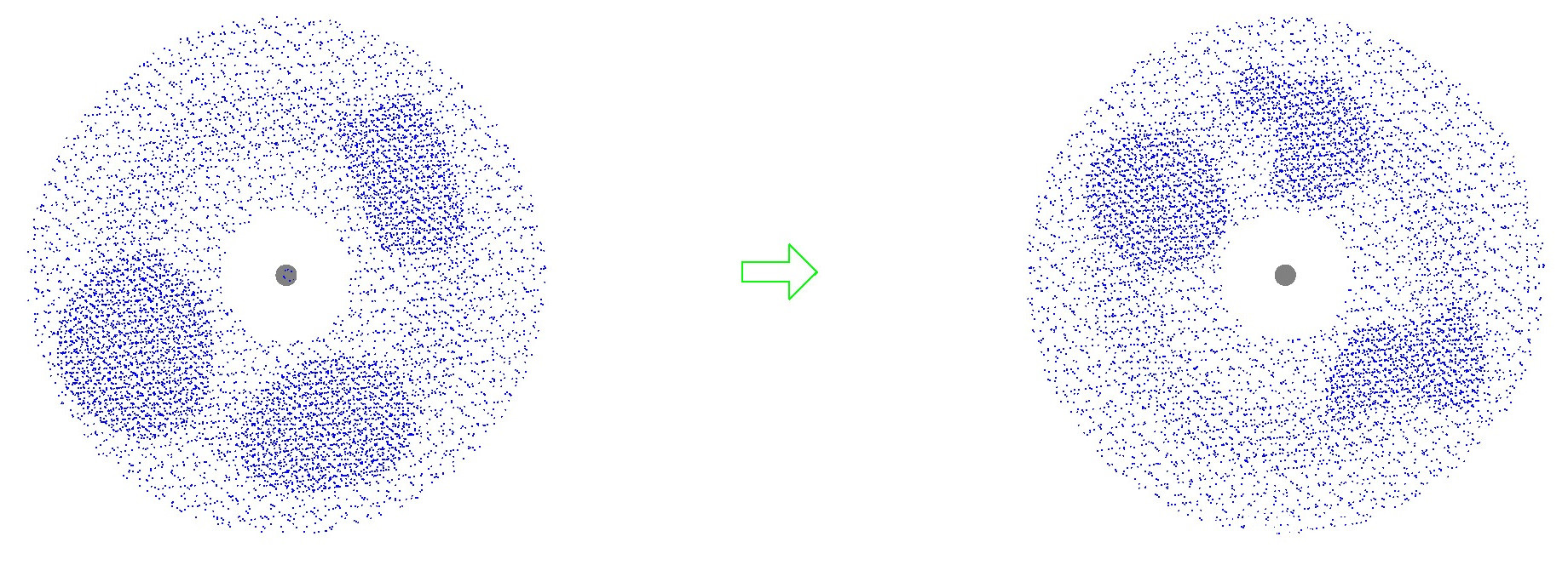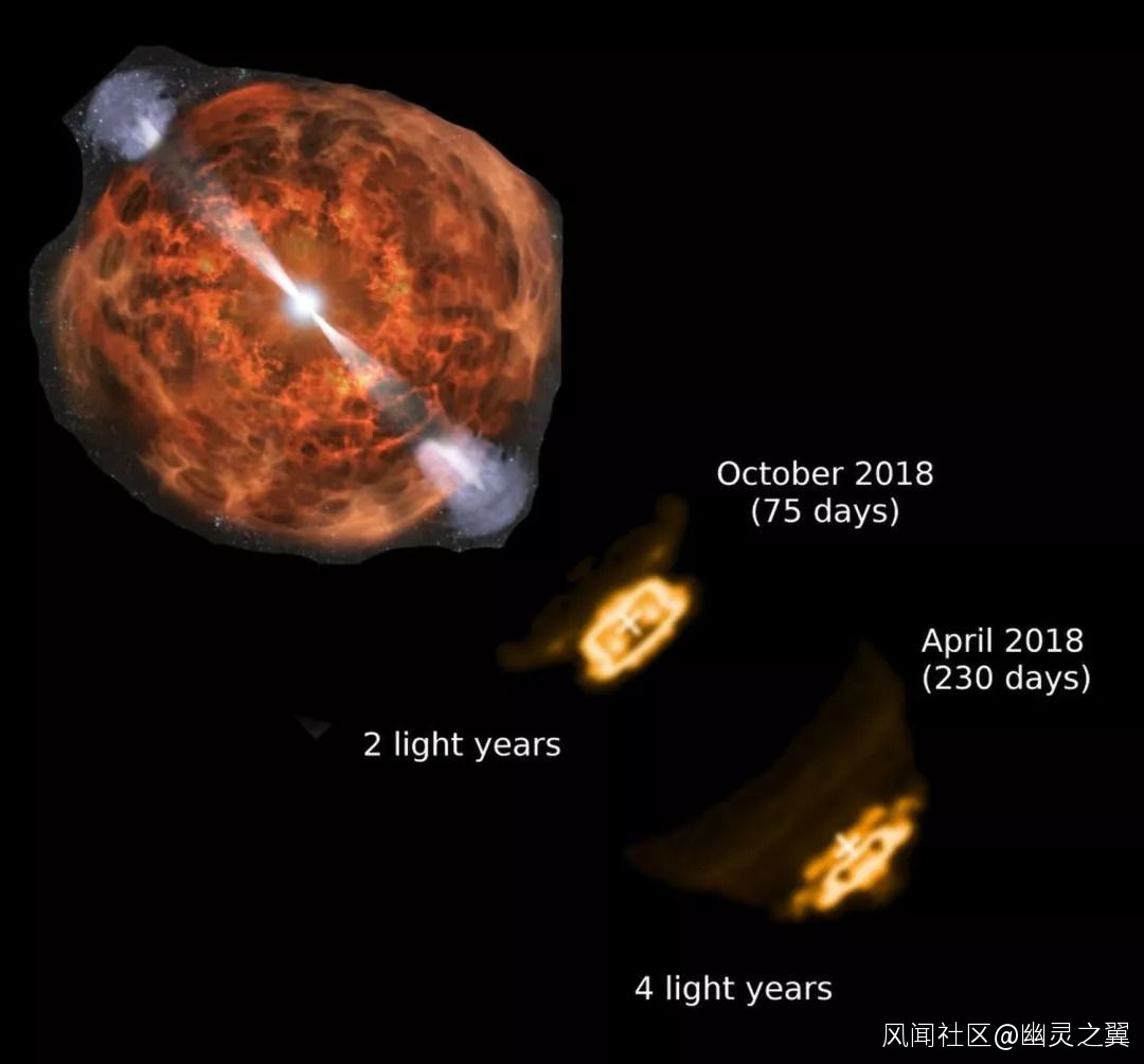 在這幅非等比尺度藝術插圖中,模擬射電圖像顯示了兩個中子星合併產生黑洞產生的超高速射流,這是在2017年8月觀測到的一個戲劇性事件。圖片:D. Berry, O. Gottlieb, K. Mooley, G. Hallinan, NRAO/AUI/NSF
