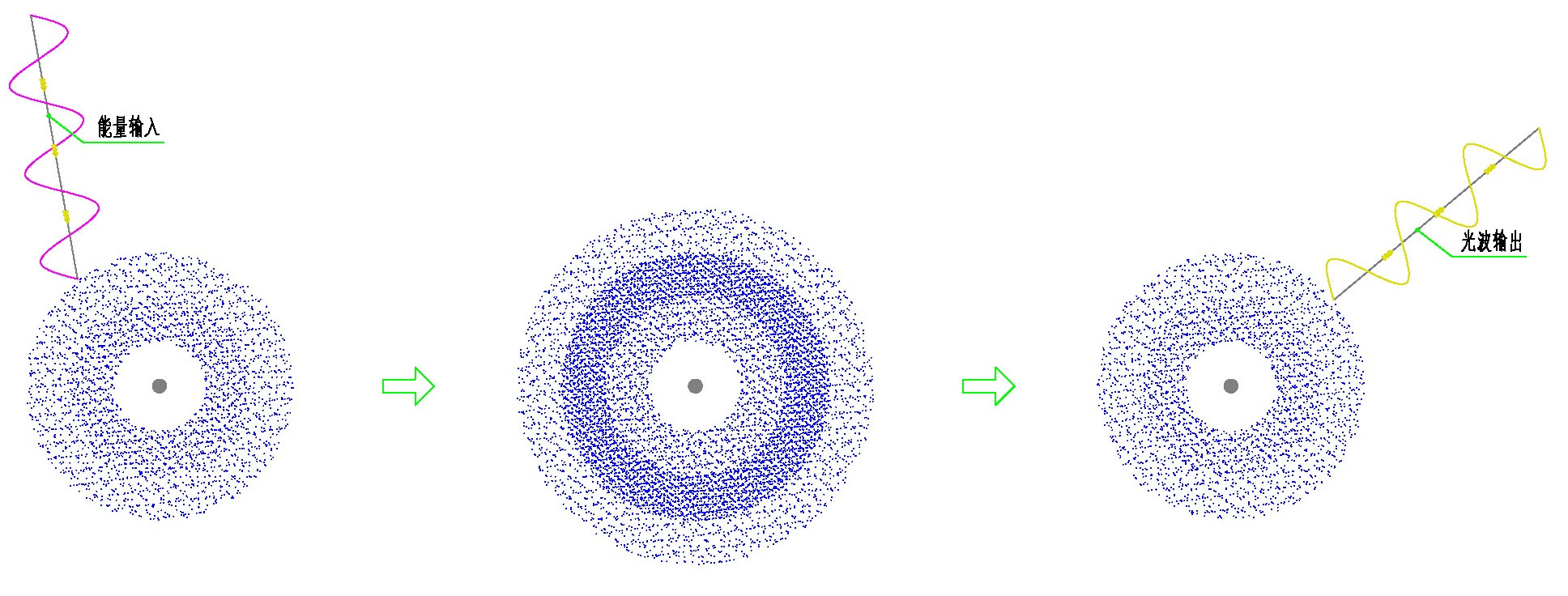 相較於之前關於原子激發態的示意圖,我們可以抽象的認為,光子與聲子作用,產生了新的光子與聲子。