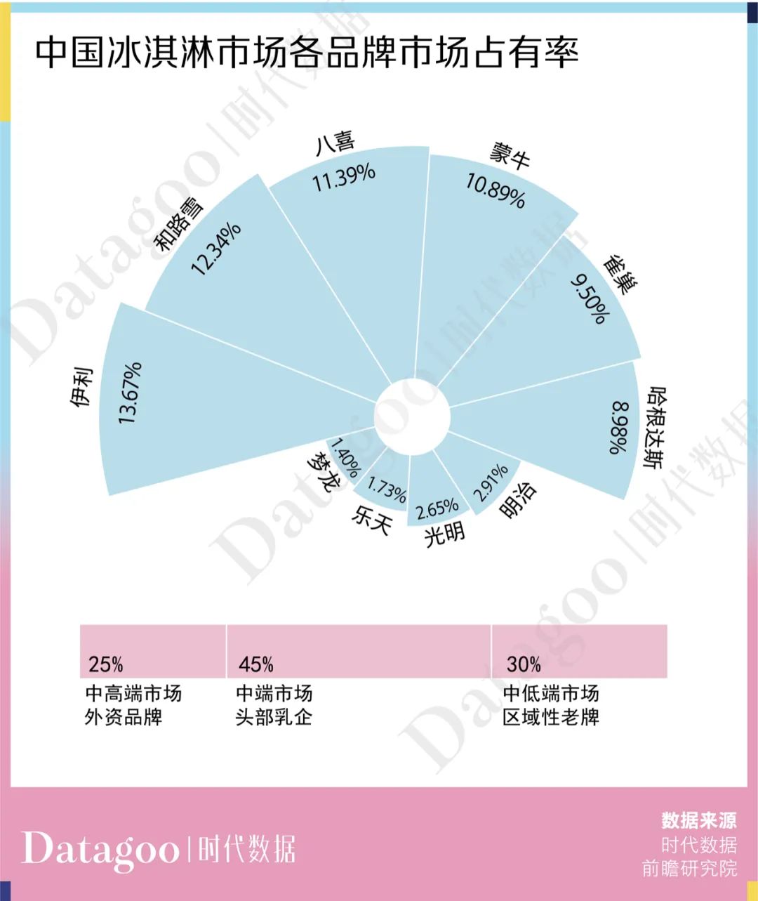 2018 年之前,以蒙牛、伊利等為首的本土老牌佔據着 45% 的中端市場;以和路雪、雀巢、八喜、哈根達斯等為代表的外資品牌佔據着 25% 的中高端市場;各種區域性品牌和地方私營小企業佔據剩下 30% 的中低端市場。