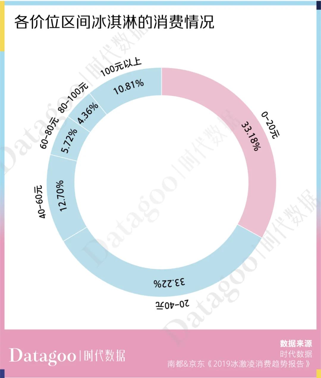 《 2019 冰激凌消費趨勢報告》顯示, 2019 年冰激凌價格區間在 20-40 元之間的組合裝,在京東整個平台的消費佔比 33.22% ,高於 0-20 元之間 33.18% 的消費佔比。100 元以上的冰激凌組合裝竟然也受到青睞,佔比接近 11% 。