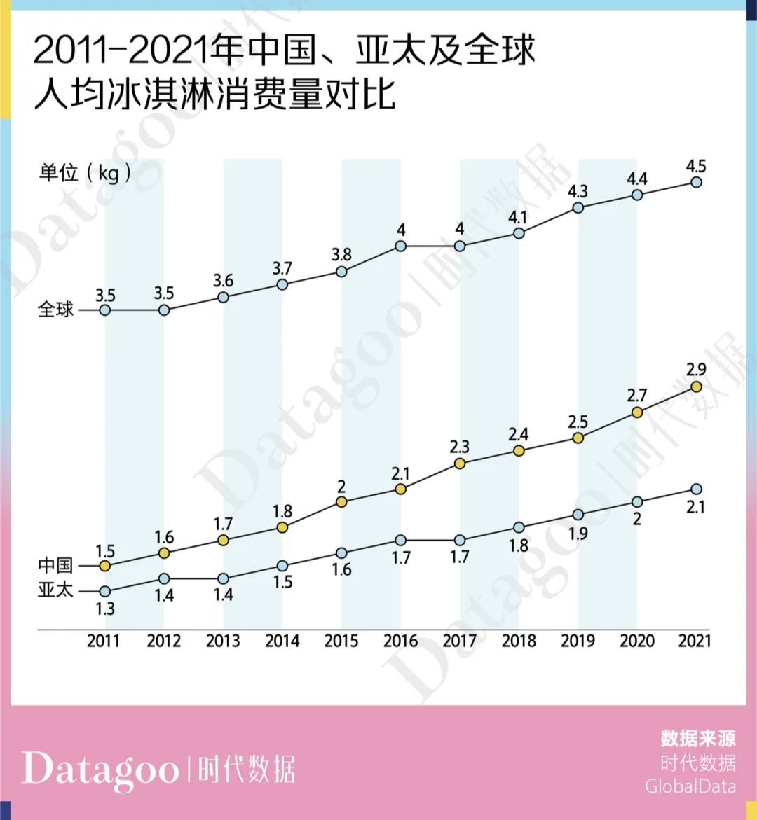 但換算到人均消費水平上,中國人均消費冰淇淋僅為 2.5 公斤,低於世界平均水平。雖然消費總量躍居全球第一,但人均仍遠落後於一些發達國家。
