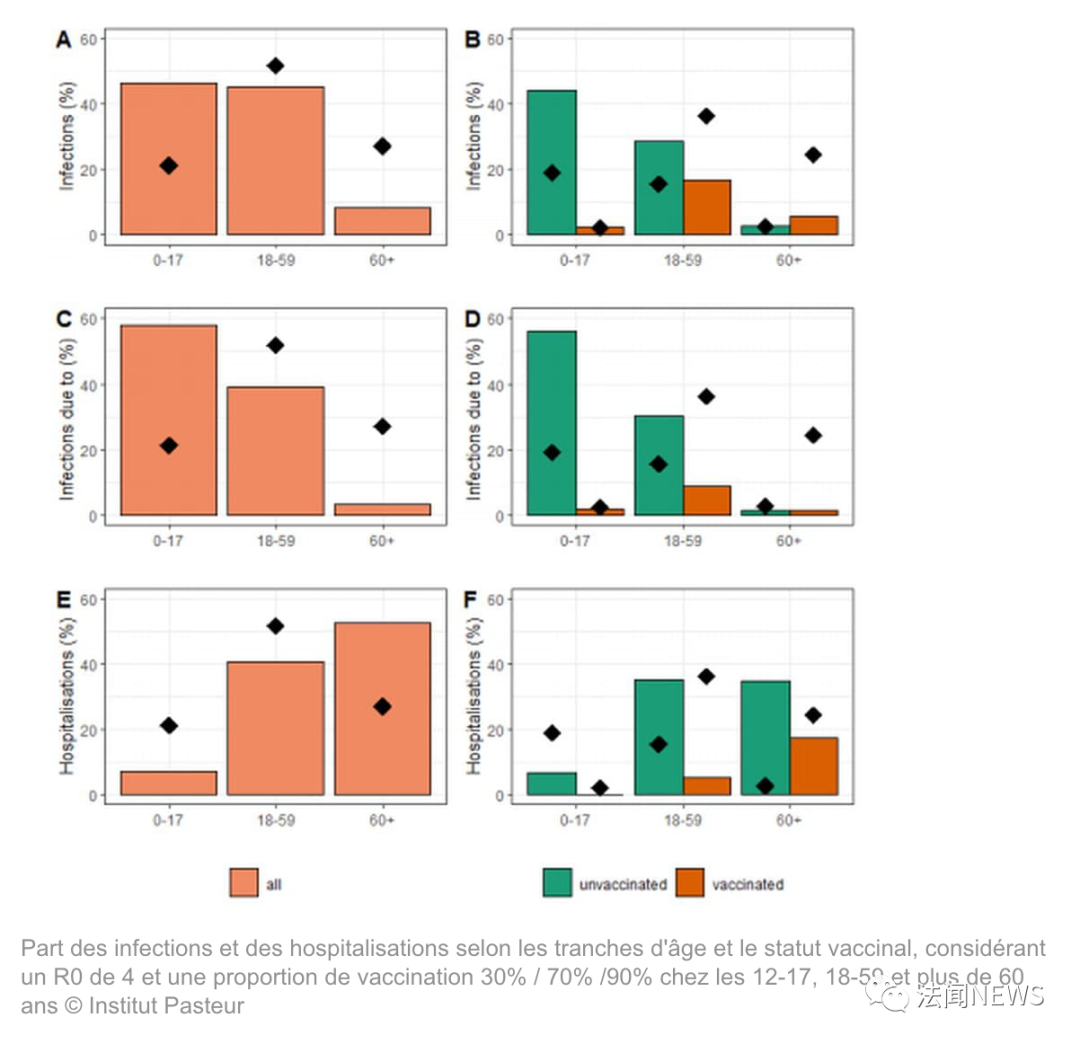 因此,研究人員指出:在接種比例30%/70%/90%的情況下,如果沒有額外的保護措施,60歲以上未接種疫苗的人只總人口的3%,但佔住院人數的35%。而且,由於兒童和青少年的疫苗接種覆蓋率低,這個羣體佔總人口的22%,但約佔感染者的一半,並約佔所有傳染者的一半。