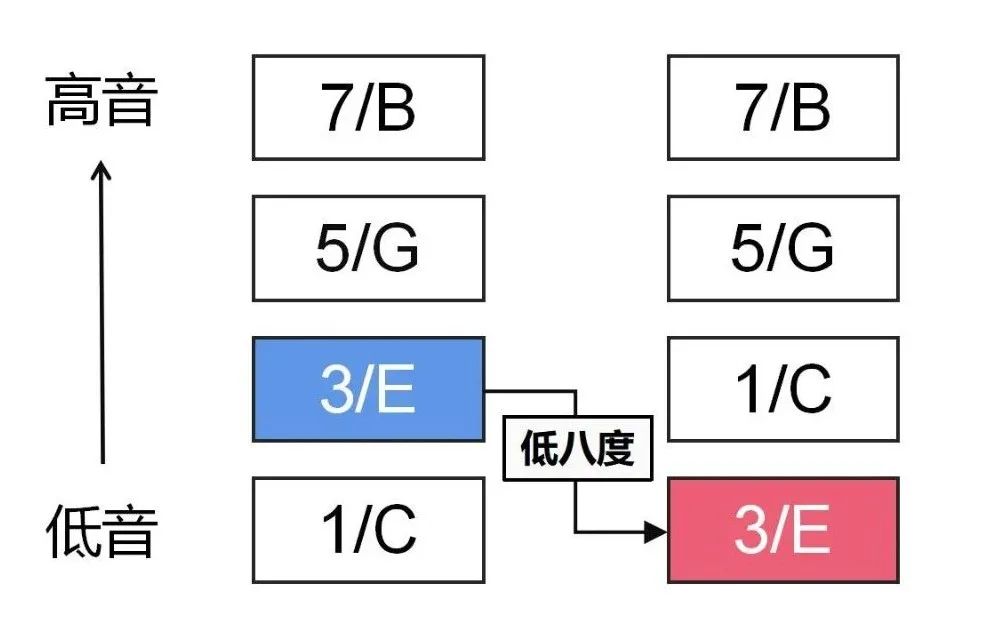 Drop3排列的定義是,將和絃排列的第3高的音,降低八度。